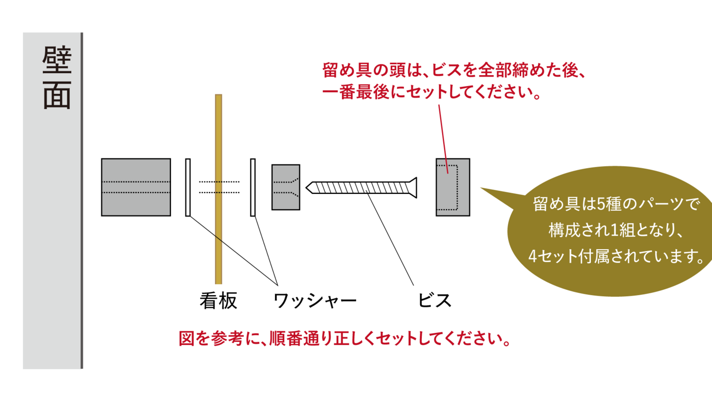 看板の取り付け方法 1.壁の取付位置に看板を当て、穴の位置に印をつける 2.印を付けた位置に小さく下穴を空ける(ビスを締めやすくするため) 3.付属の留め具を看板にセットする 4.留め具のビスを壁の穴に刺し、プラスドライバーで固定する 5.留め具の頭をセットし、完成 ご不明点など、何でもお気軽にお問い合わせください。 お電話でのお問い合わせ 受付時間/9:30〜18:00(土日祝を除く) > お問合わせ・資料請求 >ご注文はこちら ご不明点など、何でも お気軽にお問い合わせください。